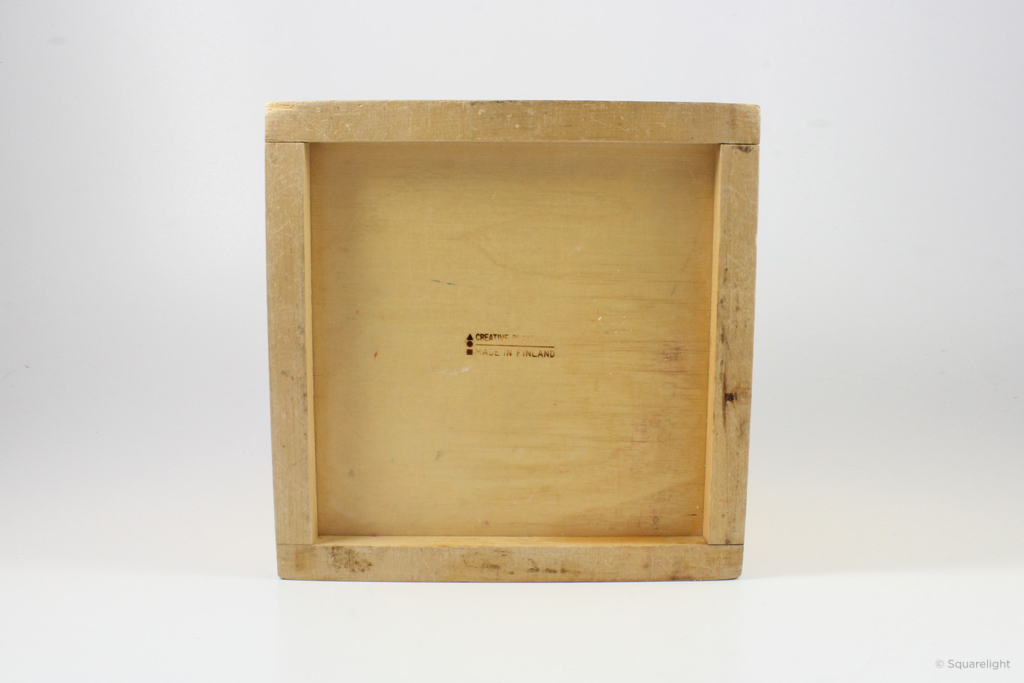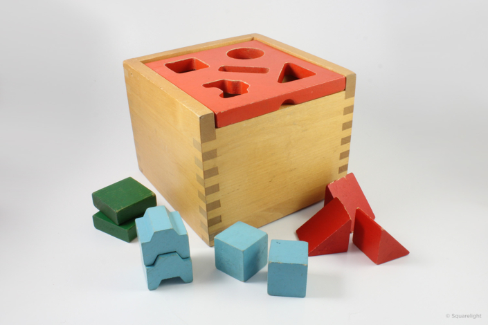 The shape sorting box has 5 shaped holes for children to sort. The first version was made out of birch and contained 3 of each shape.
