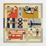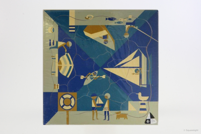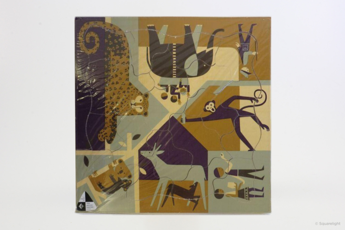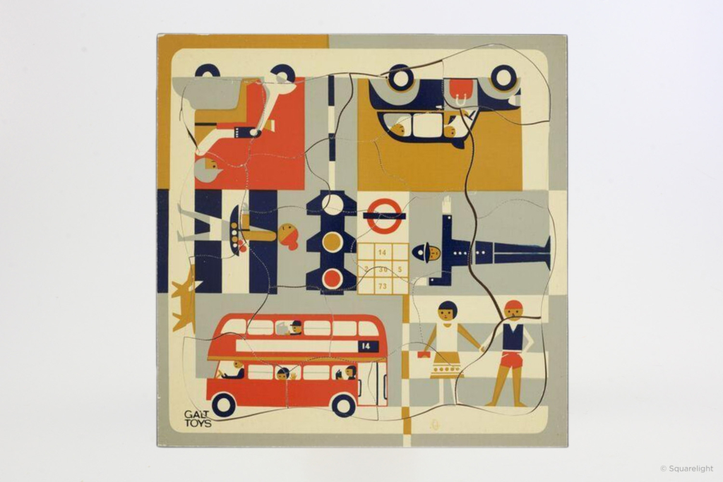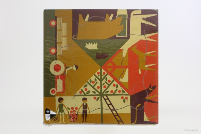 The Galt 4-Way Jigsaws were designed by Fredun Shapur and distributed through Galt Toys back in 1964. They are wooden 20-piece puzzles that were designed to be approached from any angle, promoting collaborative play. The catalog listed them as Traffic, Zoo, Seaside, and Farming.